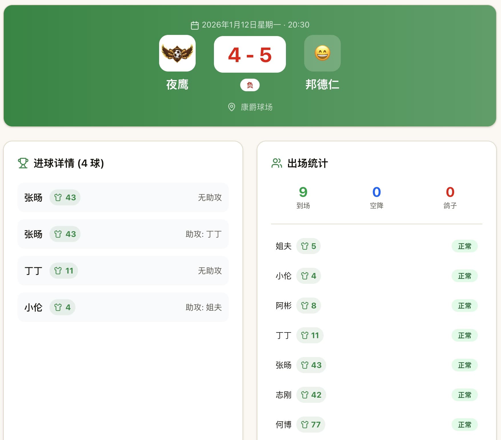赛前可快速创建占位,赛后补录到场与进球细节,流程更贴合业余球队实际。