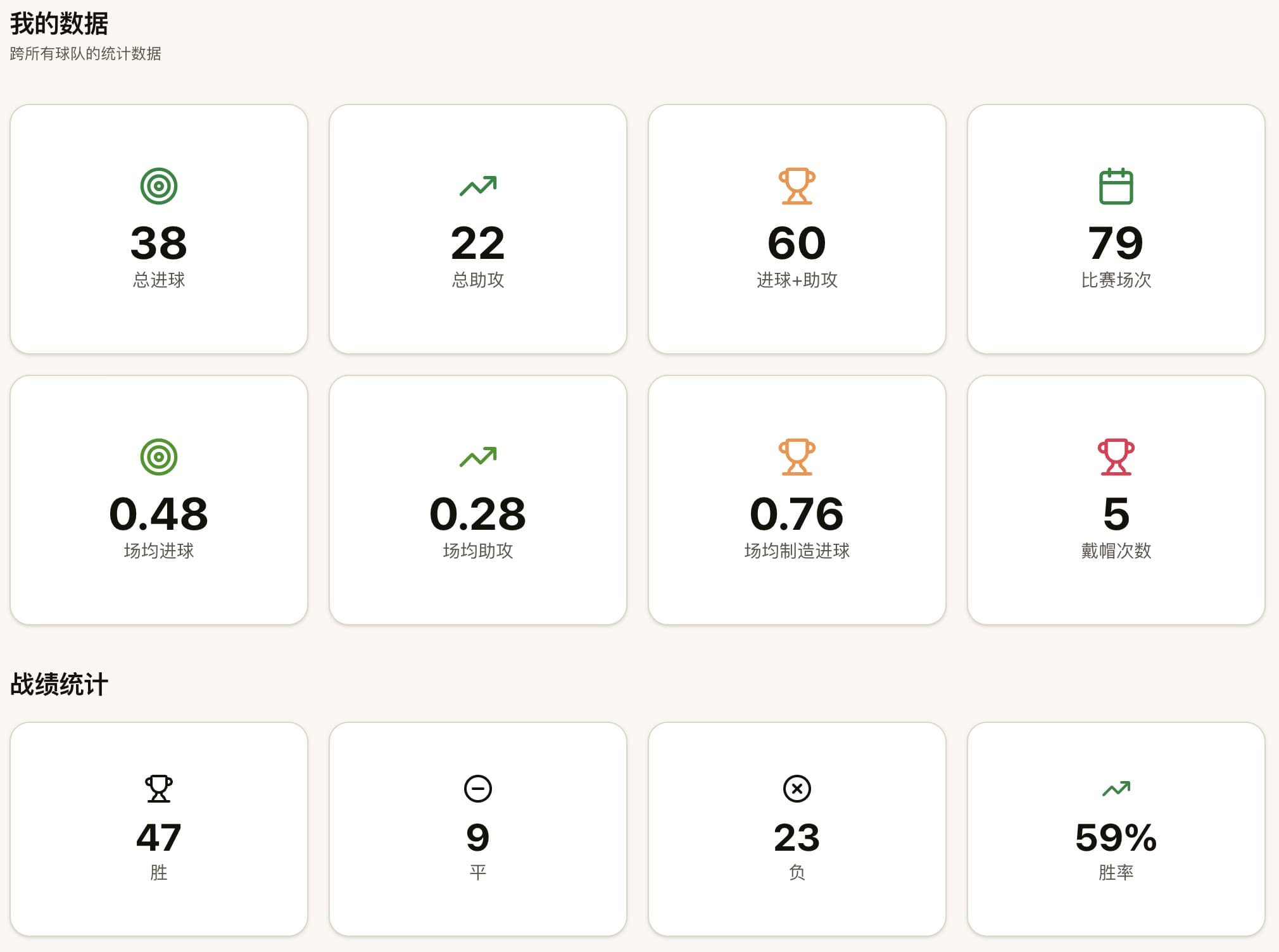 同一账号下多支球队数据统一汇总,个人与球队双维度查看。